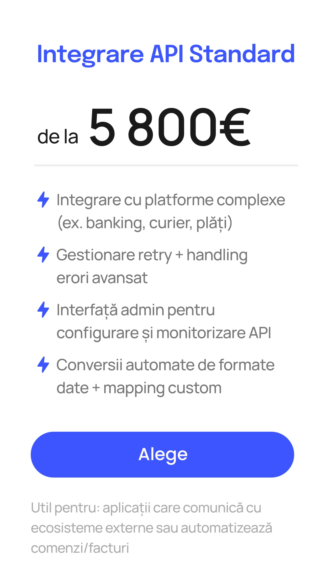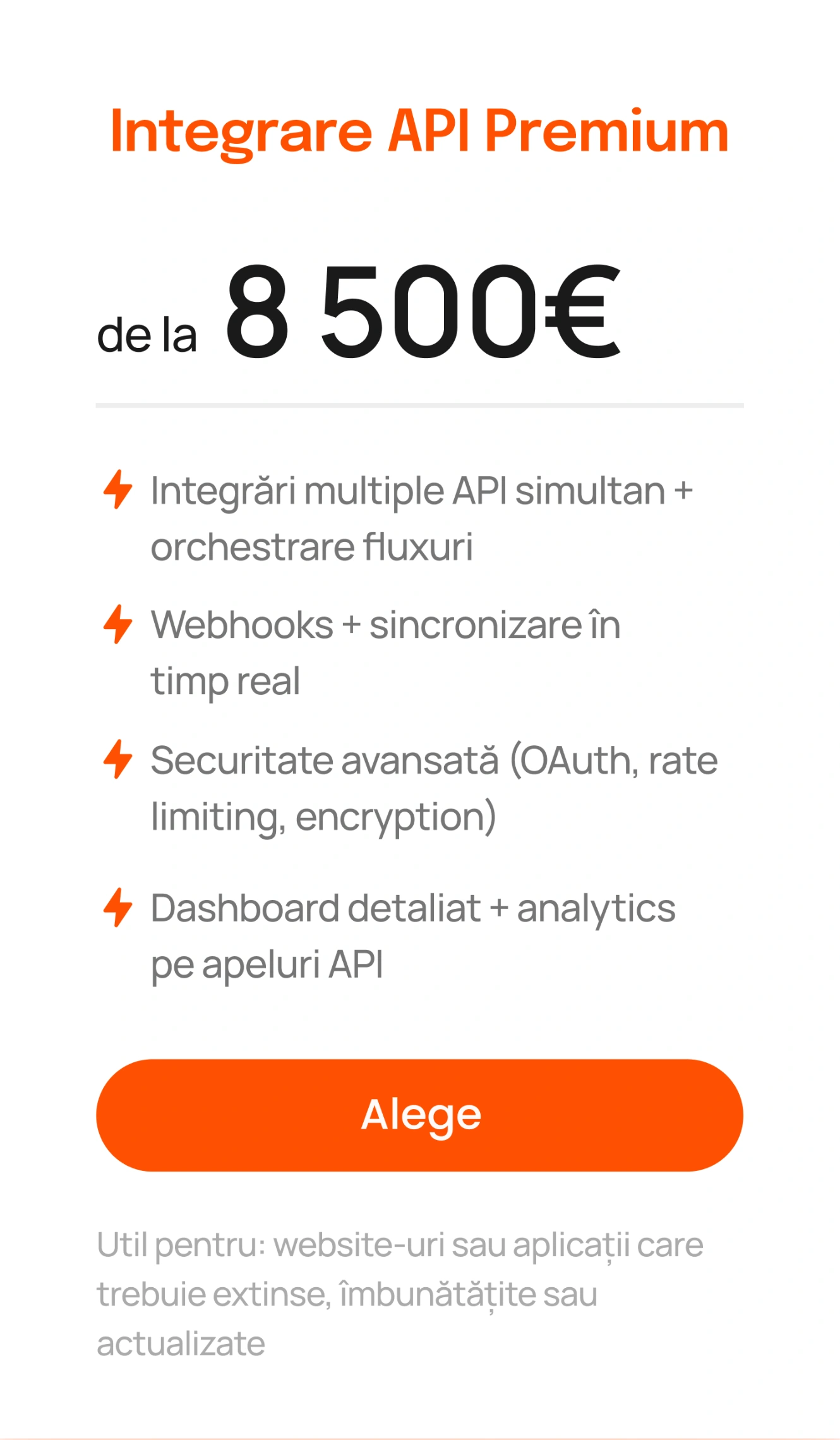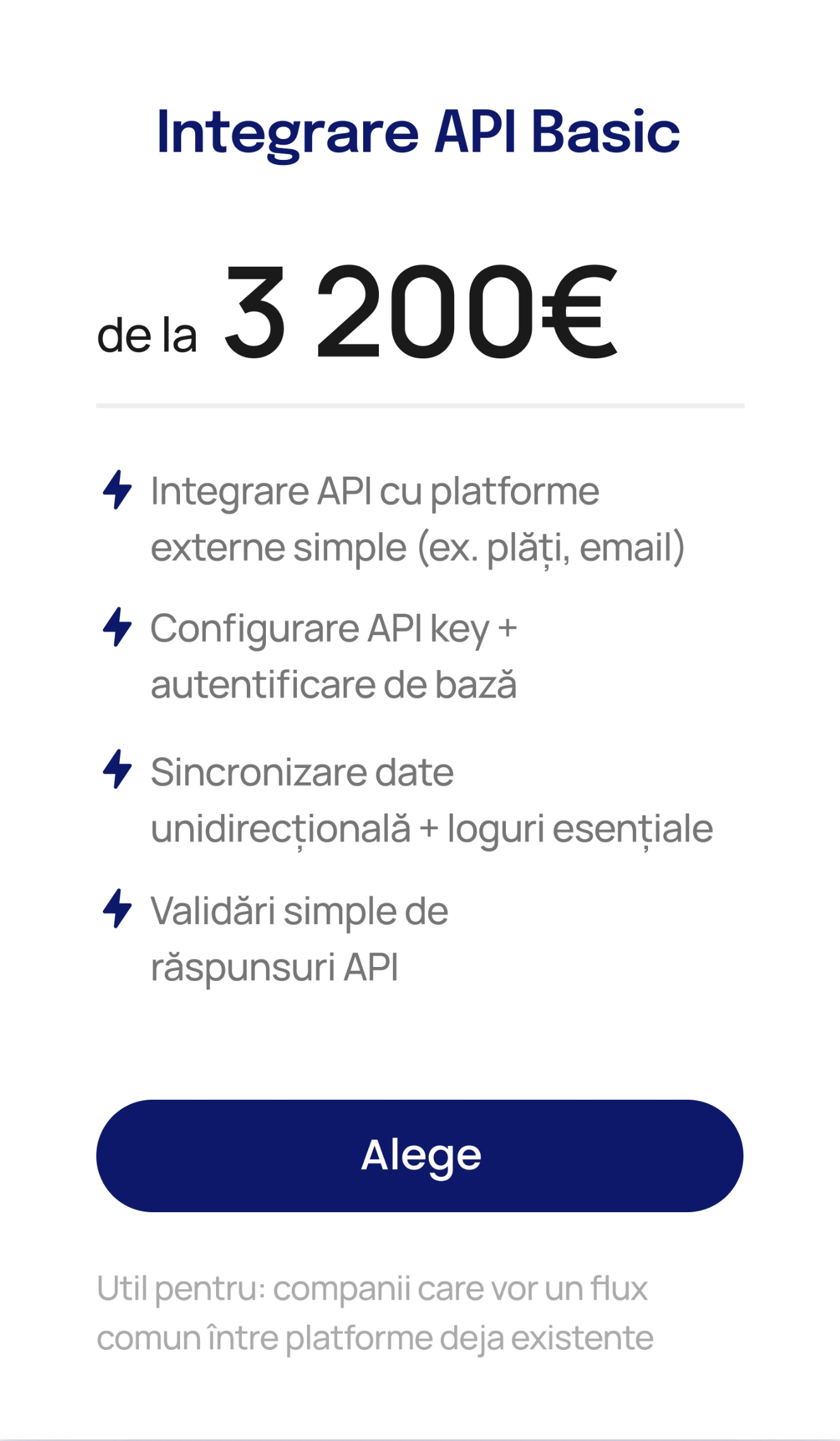 Integrezi servicii existente prin API în loc să le construiești intern. Economisești timp, costuri și reduci riscul și păstrezi controlul asupra experienței finale.