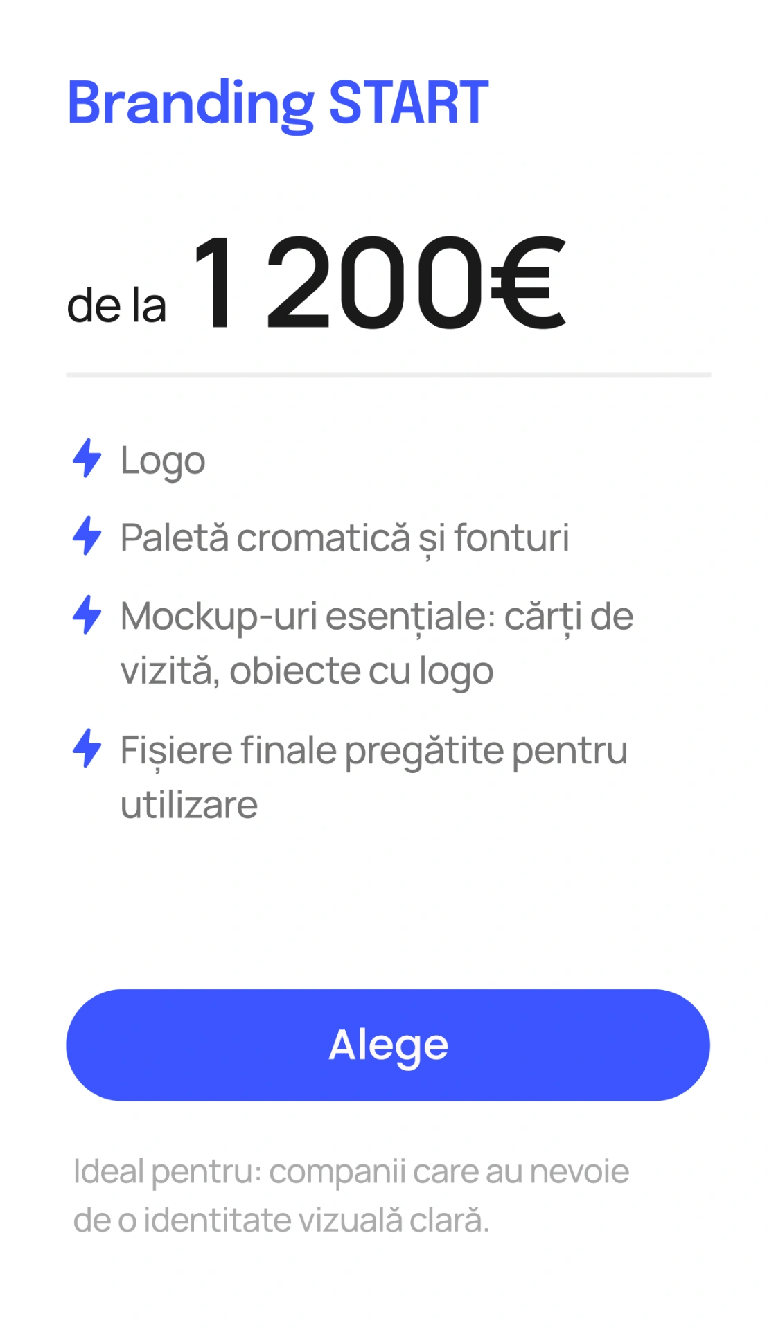 Pachetul nostru tipic include: strategie de brand (poziționare, valori esențiale, mesaj cheie), design logo și variante, paletă de culori, selecție de tipografie, elemente grafice suplimentare (iconuri, pattern-uri, ilustrații), manual complet de identitate vizuală și template-uri gata de folosit pentru materiale de marketing (site web, prezentări, social media, cărți de vizită). Totul este personalizat în funcție de nevoile și specificul afacerii tale, indiferent de domeniu.