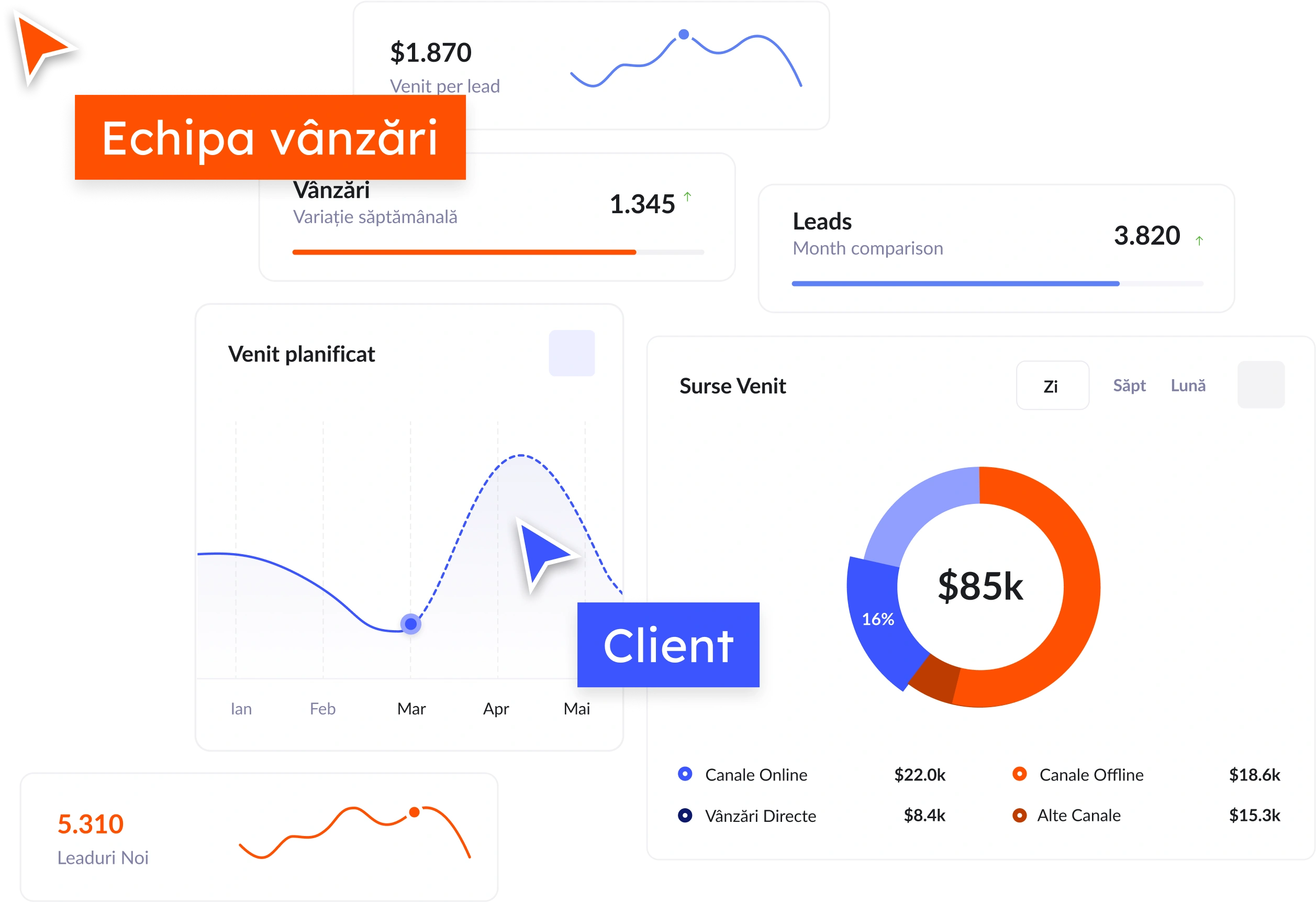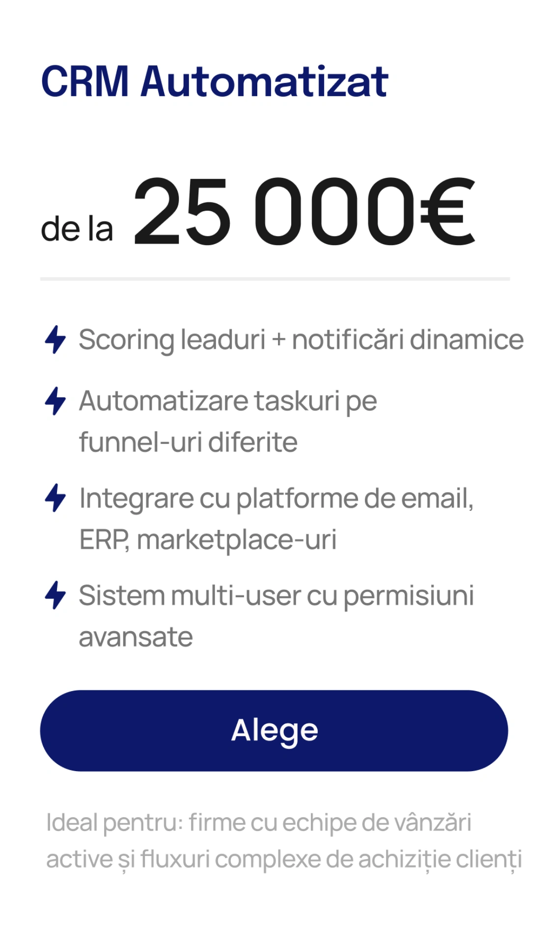 Integrări: HubSpot, Salesforce, Zoho CRM, Brevo + sincronizare cu ERP pentru stocuri/comenzi/facturare.