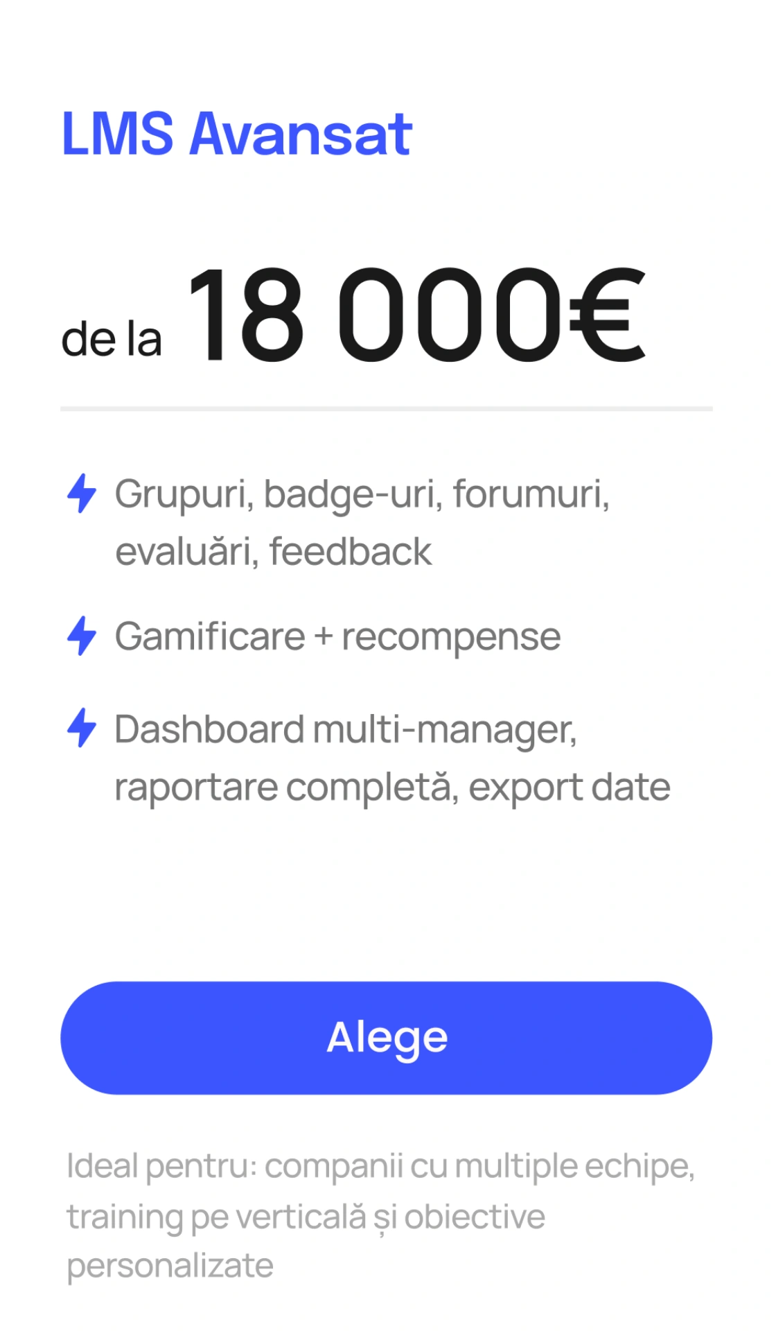 Funcționalitățile de bază includ: creare și organizare cursuri (video, text, quiz-uri, fișiere), management utilizatori și grupuri, progres tracking, evaluări și certificări automate, gamification (puncte, badge-uri, leaderboard), forumuri și comunicare, raportare detaliată și dashboard-uri. Opțional adăugăm funcții avansate precum învățare adaptivă, integrare webinar, mobile app sau SCORM compliance.